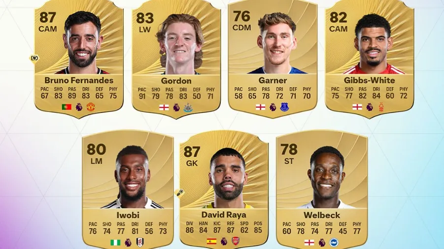 PL POTM title for March 2026 features seven standout performers in the domestic league. The list includes star faces: Bruno Fernandes, James Garner, Gordon, Gibbs-White, Iwobi, Raya, and Welbeck.