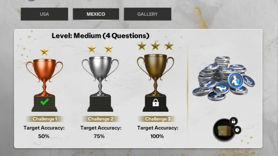 FC Mobile A Nation's Story Mexico gives you a chance to answer some trivia questions every day. The questions are related to the country in focus. After logging into the game, you have to get to the nation's story section, where you are required to answer four back-to-back questions. The questions are in an objective format with 4 options available, and you have to select the right one. If your answer is correct, you get the rewards.