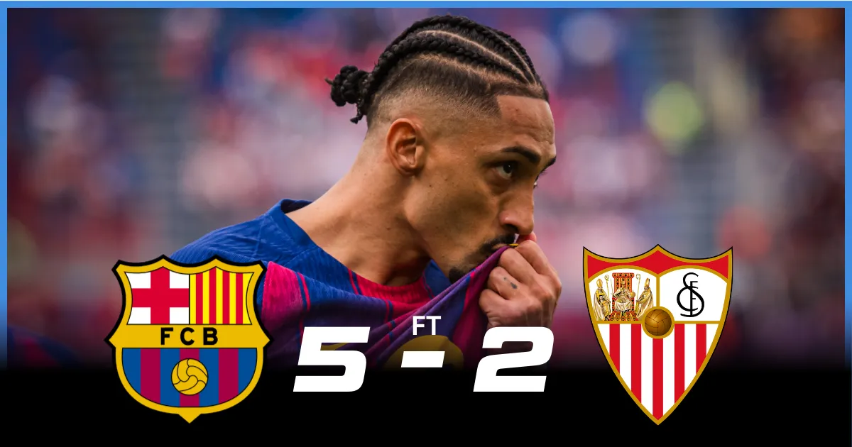 - Barcelona demolished Sevilla 5-2 at the Camp Nou in a dominant La Liga display, with captain Raphinha's hat-trick the undoubted highlight of a stunning afternoon of attacking football.