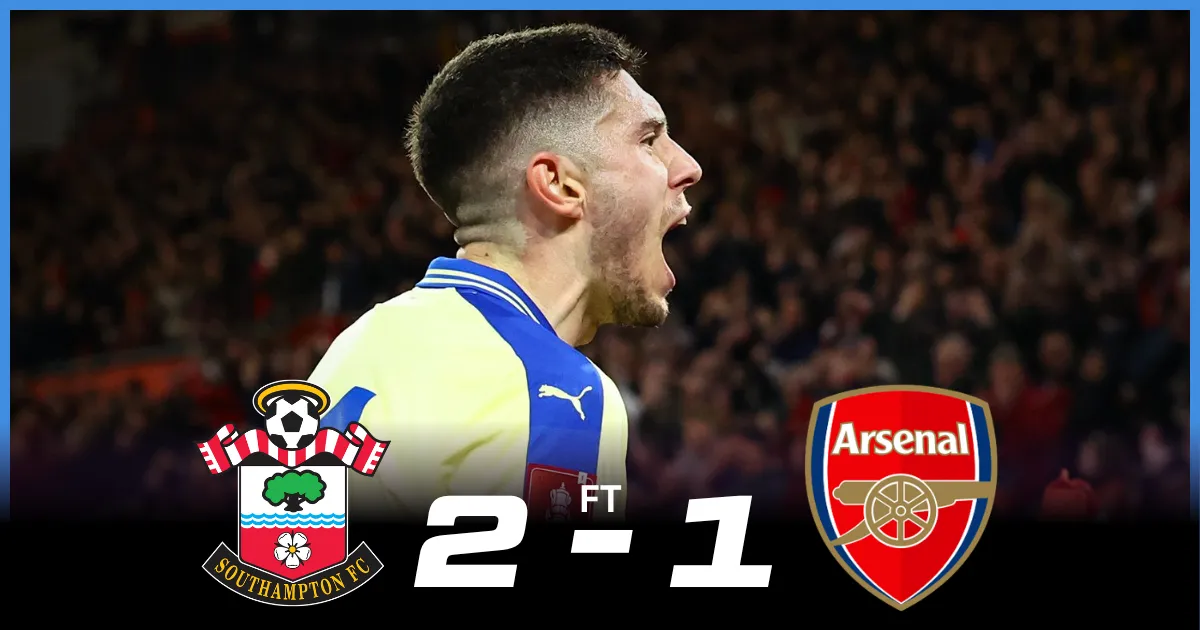 Championship side Southampton produced one of the Emirates FA Cup's great upsets, defeating Premier League leaders Arsenal 2-1 at a noisy St Mary's Stadium to book their place in the semi-finals. Ross Stewart broke the deadlock in the 35th minute, poking home after Ben White's misjudgement gifted him an easy chance. Arsenal responded well and found their leveller through Viktor Gyokeres in the 68th minute. Still, the night took a worrying turn moments later when Gabriel was forced off with a knee injury, replaced by William Saliba. This blow could have significant consequences with the Champions League quarter-final against Sporting CP just days away.