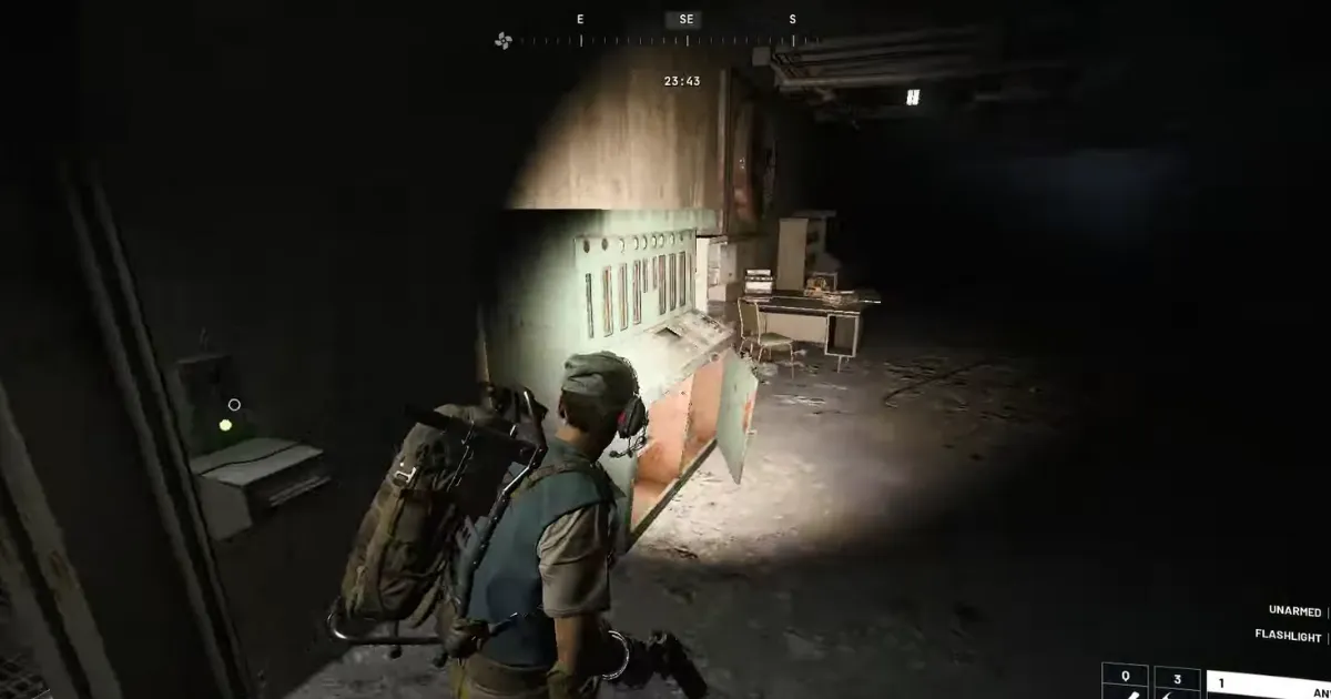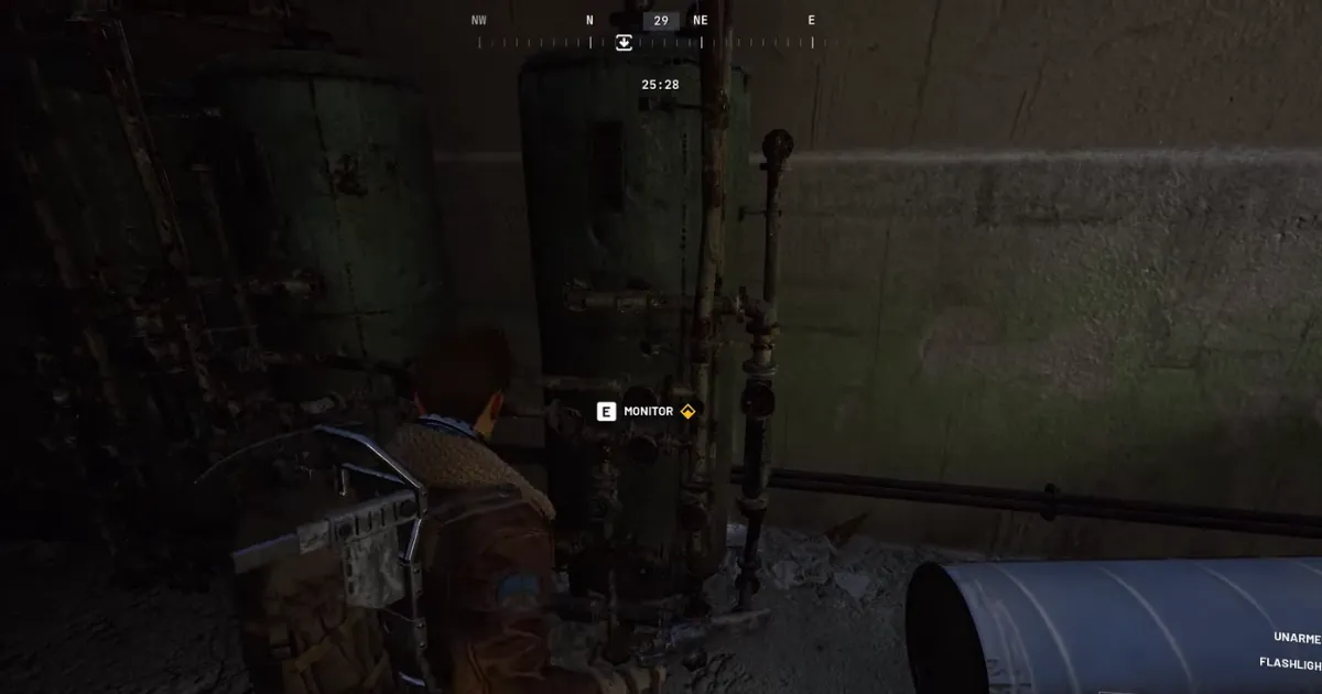 When you find the bunker, head inside and go down the stairs. At the bottom, you’ll see large boiler- or gas-tank-like machines. Interact with this system to check the purification process.