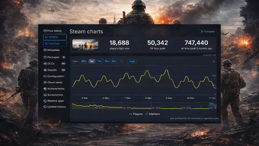 Battlefield 6 launched in October 2025 with a massive start, peaking at around 747,000 concurrent players on Steam. Months later, player numbers have dropped significantly from that launch, raising questions within the community about the game’s long-term momentum and whether its popularity is beginning to fade. That said, here's everything you must know about the Battlefield 6 Player Count March 2026.