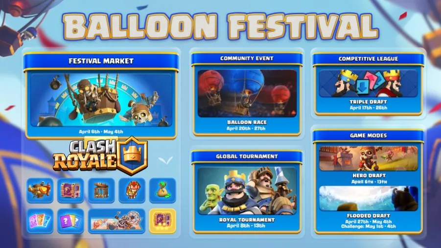 There are a total of six new Clash Royale April Events in 2026. The new Festival Market replaces last season's Clash Royale Album Event as this season's month-long event. Additionally, there are other Clash Royale Balloon Festival Events, explained below: