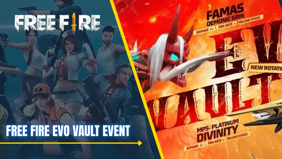 The Free Fire Evo Vault Event offers premium Evo guns like Demonic Grin FAMAS and MP5 – Platinum Divinity with enhanced gameplay attributes.