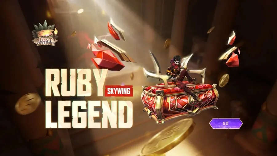 - Free Fire MAX Ruby Legend Skywing arrives via the Lost Treasure Faded Wheel with ruby-red and gold design.