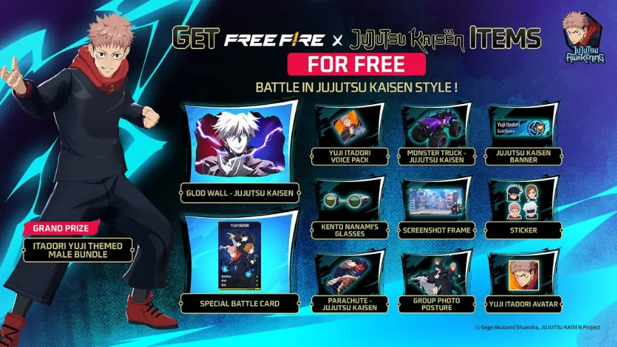 You will get a ton of new Jujutsu Kaisen items in the game, including original voice packs, outfits, vehicle skins, special battle cards and more. Yuji Itadori is the grand prize for the themed male bundle.