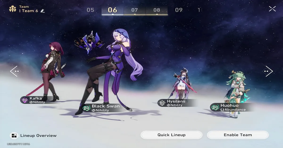 Here, Kafka is your main damage dealer, while Black Swan and Hysilens will keep putting DoTs on their target making sure the enemy receives damage constantly and HuoHuo makes sure everyone is max on their HP and Energy.